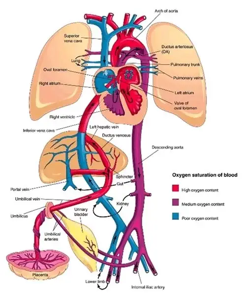 - Ducto Venoso: O sangue altamente oxigenado vindo da placenta pela veia umbilical entra no feto. Cerca de metade deste fluxo perfunde o fígado, mas a outra metade é desviada diretamente para a veia cava inferior (VCI) através do ducto venoso, fazendo um bypass hepático.