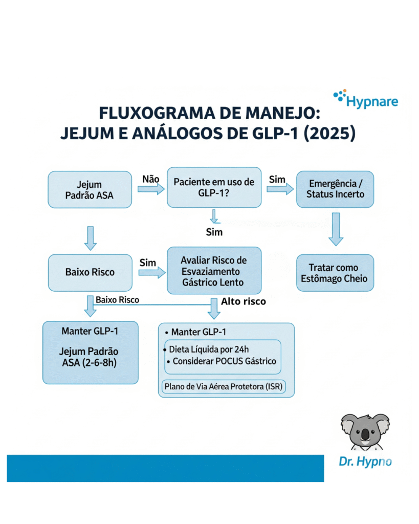 • Baixo → manter GLP-1 + jejum ASA (líquidos claros até 2 h).